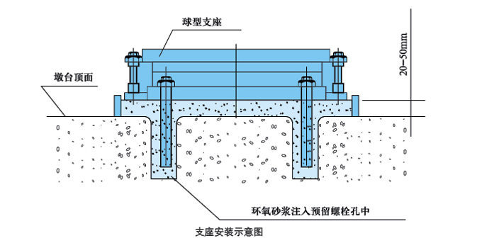 b、安裝支座及地腳螺栓:在下支座板四角用鋼楔塊調(diào)整支座水平,并使下支座板底面高出橋墩頂面 20 - 50mm,找正支座縱、橫橋向中線位置,使之符合設計要求。用環(huán)氣砂漿灌注地腳螵栓孔及支座底面墊層 (見下圖>。