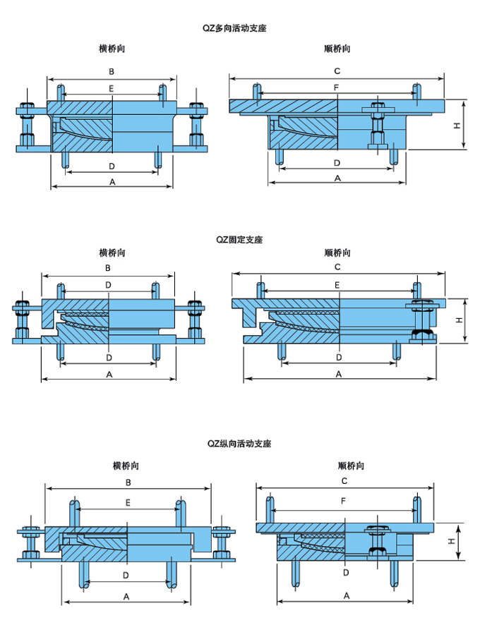 QZ系列球型支座是由上座板、下座板、凸形中間板及兩塊不同形狀的聚四氟乙烯板組成。下座板中間為 一凹形球面,同凸形中間板相對應,兩者之間襯有一弧形四氟板,通過球面與之滑動來滿足梁端的轉(zhuǎn)動;上座 板上的不銹鋼板與中間鋼板上的另一四氟板組成第二滑動面,完成梁體因溫差諸因素產(chǎn)生的伸縮位移。