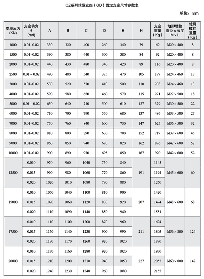 a、支座反力(豎向承載力)分為 16級:1000、1500、2000、2500、3000、4000、5000、6000、7000、 8000、 9000和10000、 12500、 15000、 17500、 20000KN。
