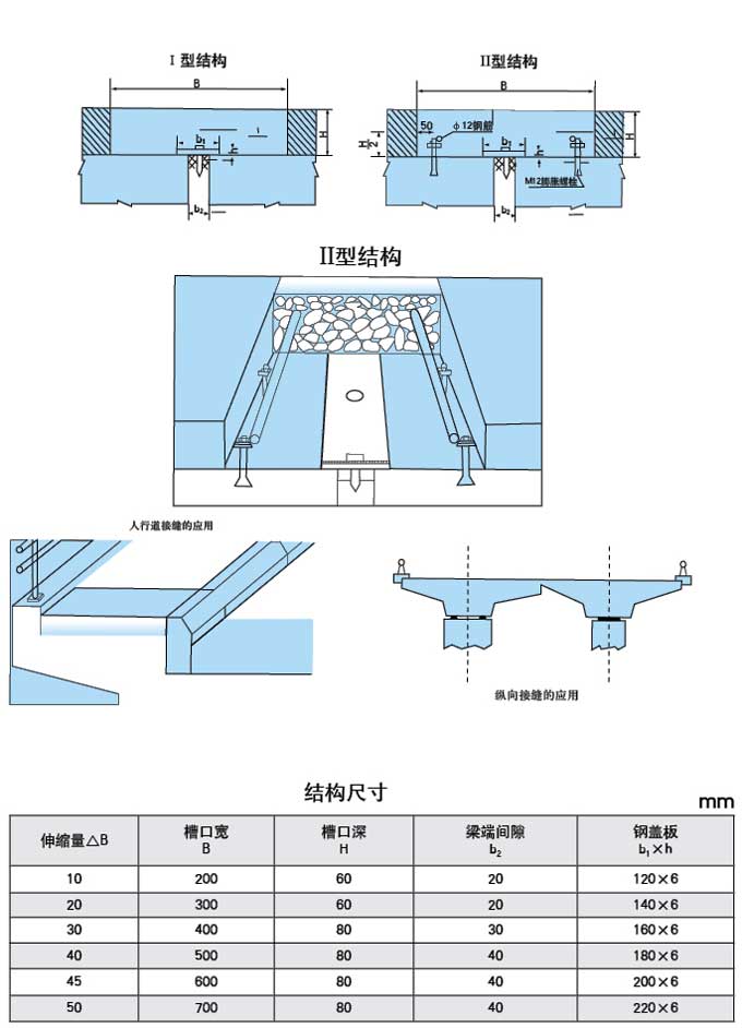 適用于-25<至+601溫度地區(qū),伸縮量在50mm以下的公路橋梁、城市立交橋、髙架橋等橋梁的伸縮接縫。