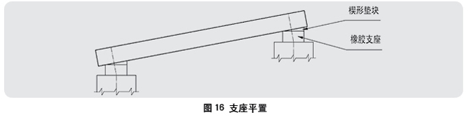 b梁體縱坡時,在梁底與支座之間粘結(jié)一塊與梁縱坡一致的楔型墊塊,支座平置。如圖16