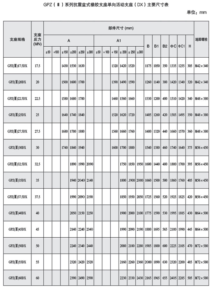 a.GPZ(BI)系列公路橋梁抗震盆式橡膠支座按其使用時的位移能力分為二類,即單向活動支座具有豎向 轉(zhuǎn)角功能和單一方向位移功能,代號DX;