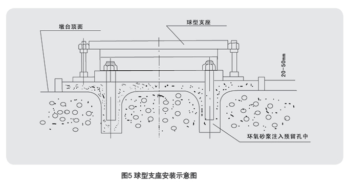 a安裝支座板及地腳螵栓:在下支座板四角用鋼楔塊調(diào)整支座水平,并使下支座板底面髙出橋嫌頂面20 50mm,找正支座縱、橫中線(xiàn)的位置,使之符合設(shè)計(jì)要求。用環(huán)氣樹(shù)脂砂漿灌注地腳嫌栓孔及支座底面墊層。 (圖5 )